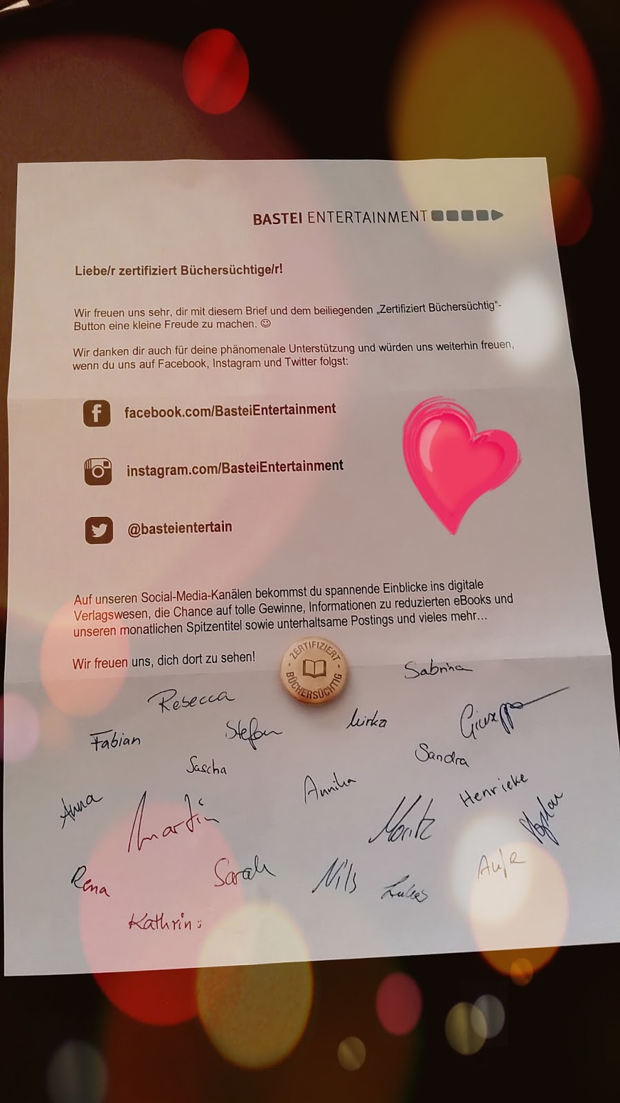 Hallo ^^ Ich wollte euch nur mal kurz zeigen, was bei mir so schönes ankam vor ein paar Tagen. Ich gehöre nun offiziell zur Hall of zertifizierte Buchsüchtige xD Hab mich sehr gefreut und nochmal danke an BasteiEntertainment für die schnelle zusendung ! Eure gяєу